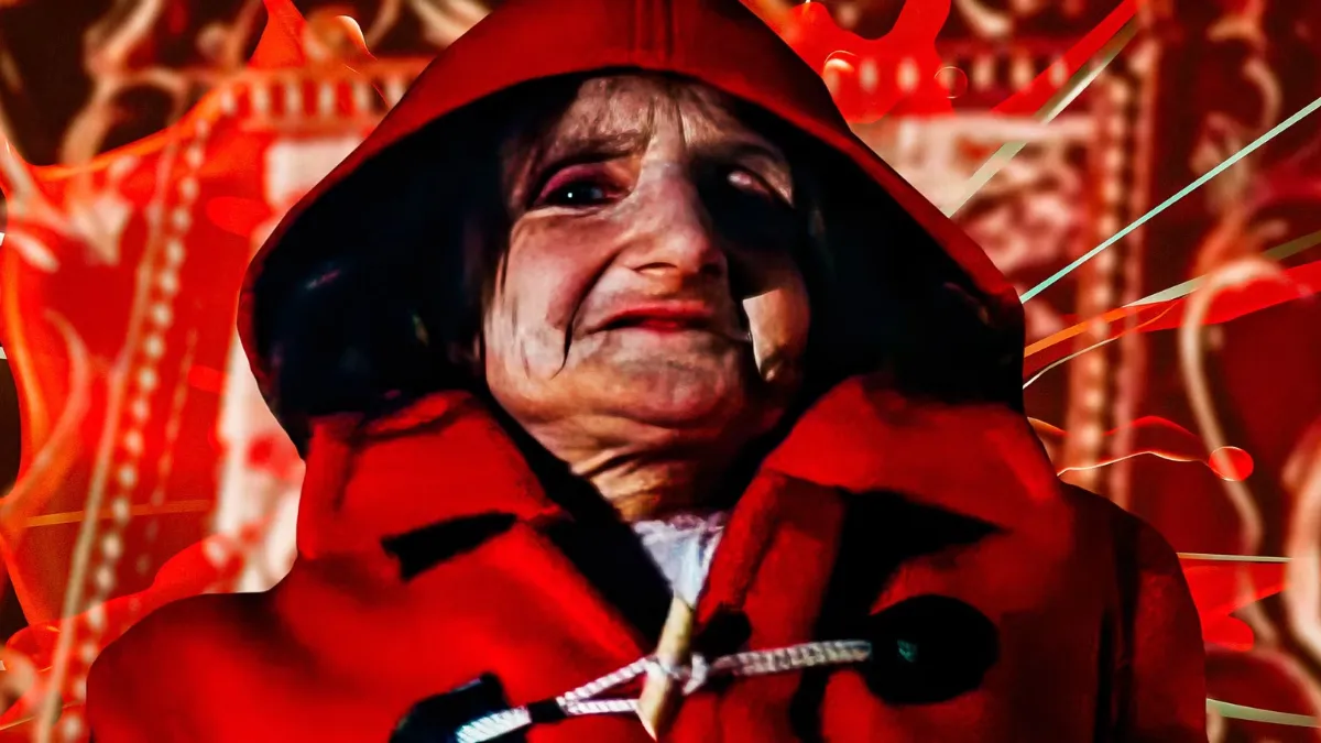 When John faces the elusive red-cloaked figure, the climax occurs. Instead of the revelation he was expecting about his daughter, he discovers an elderly, mute woman with dwarfism (Adelina Poerio). Before she suddenly draws a knife and murders John, there is a terrifying moment created by her strange smile and gradual head shaking. The film's mystery is transformed into visceral terror by the scene's violent finality, leaving spectators in a state of shock.