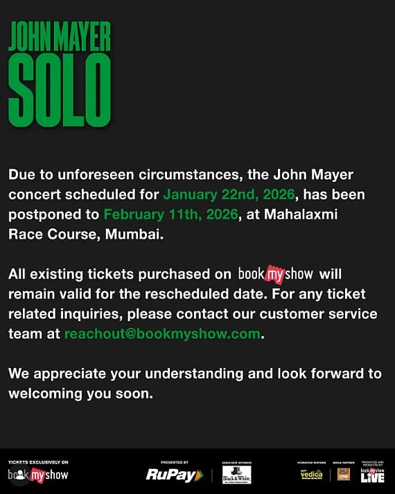 Despite the excitement building up for his first live show in India, organizers confirmed that John Mayer's India debut concert has been postponed due to "unforeseen circumstances." The Grammy‑winning singer‑songwriter was originally scheduled to perform in Mumbai on 22nd January, 2026, at the iconic Mahalaxmi Race Course. In order to give spectators a few more weeks to get ready for what seems to be a historic performance, the event has now been rescheduled for 11th February, 2026, at the same location.